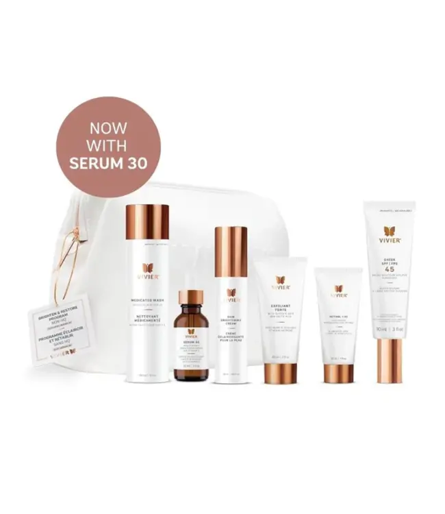 This Brighten & Restore Program includes a complete routine of products designed to improve the look of dark spots, fine lines, irregular texture and tone, while protecting against future damage and recapturing a natural healthy glow without the use of hydroquinone.