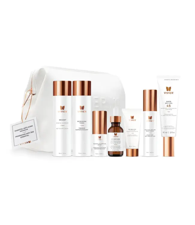 This Essential Anti-Aging Program includes a complete routine of products designed to address moderate to significant signs of aging including fine lines, wrinkles, uneven skin tone and texture while protecting against future damage.